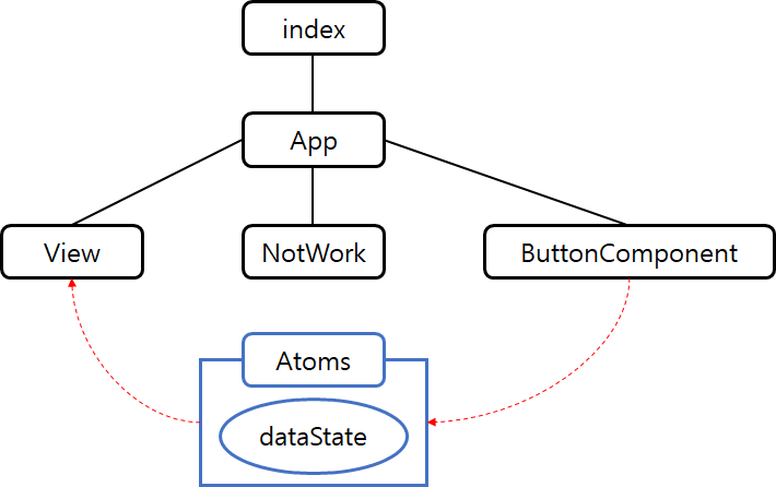 부모 컴포넌트의 state를 공유하지 않고 Atoms이라는 저장소에 상태를 관리합니다. 컴포넌트들은 Atoms에 접근하여 상태를 공유하기 때문에 상태를 공유하기 위해서 더 이상 부모 컴포넌트의 state에 의존하지 않아도 됩니다.