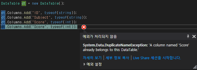 Add 메서드의 문제는 컬럼명이 DataTable에 존재하는데, 동일한 컬럼명으로 추가하면 예외가 발생합니다.