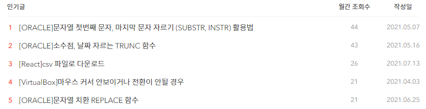 여전히 오라클 관련 포스팅이 순위권에 차지하고 있습니다.