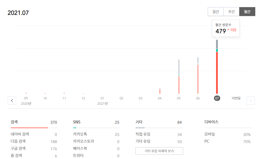 6월과 차이가 있다면, 7월 16일 구글 애드센스 자동 광고를 설정하였고 카카오 애드핏 상단, 하단, 사이드바에 광고를 배치했습니다.
