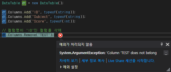Remove 메서드의 문제는 컬럼명이 DataTable에 존재하지 않는데, 삭제를 하려고 하면 예외가 발생합니다.