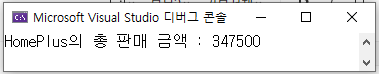 Console.WriteLine("HomePlus의 총 판매 금액 : " + homeplusTotalPrice);