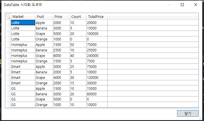 dt.Rows.Add("Lotte", "Apple", 2000, 10);