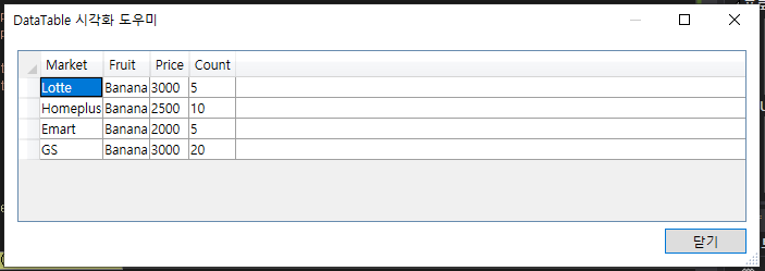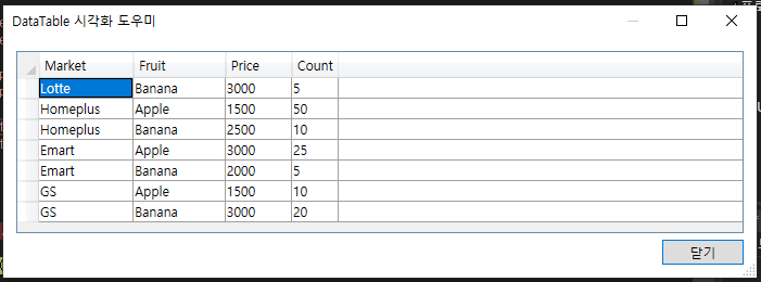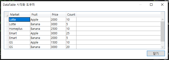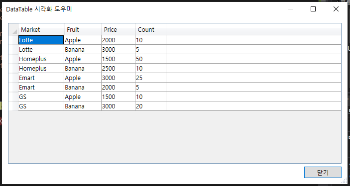 dt.Rows.Add("Lotte", "Apple", 2000, 10);