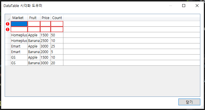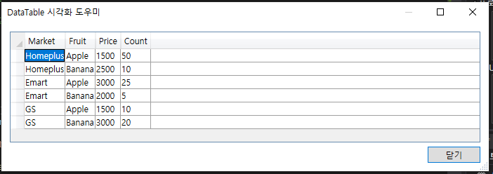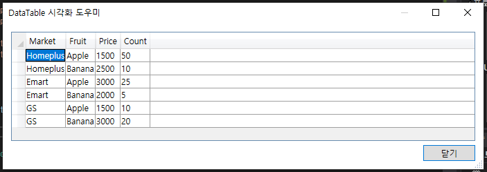 dt.Rows.Add("Emart", "Banana", 2000, 5);