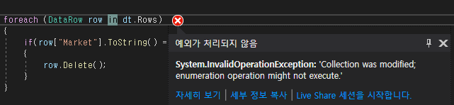 아래 코드는 foreach문을 사용하여 DataRow에 접근하여 Delete 메서드를 사용했습니다.