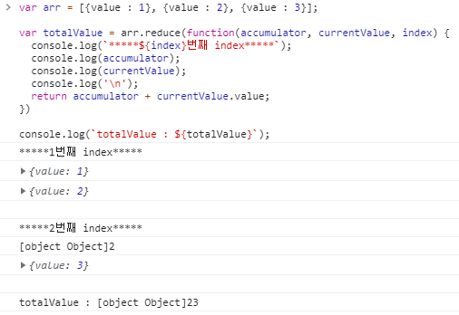 배열 요소의 순회는 initialValue에 설정 유무에 따라 순회를 시작하는 index 0부터 시작할수도 있고 index 1부터 시작할수도 있습니다.