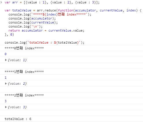 var totalValue = arr.reduce(function(accumulator, currentValue, index) {
