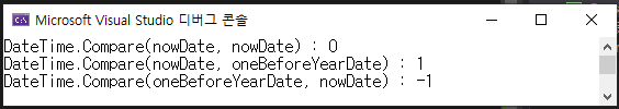 Console.WriteLine("DateTime.Compare(nowDate, oneBeforeYearDate) : " + DateTime.Compare(nowDate, oneBeforeYearDate));
