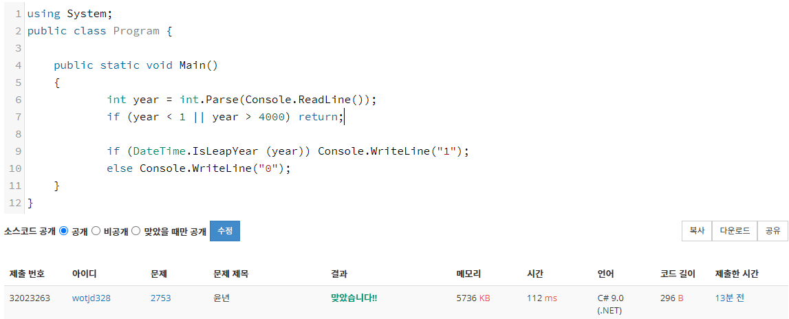 백준 2753번 문제는 입력한 값이 윤년인지 아닌지 판별하는 문제입니다.