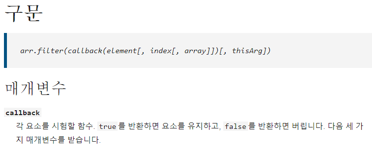 MDN 사이트에서 filter 함수를 검색해보면, filter 함수 안에 callback 함수를 인수로 받는다고 설명합니다.