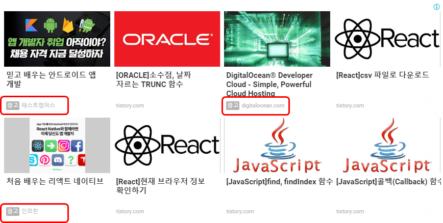 일치하는 콘텐츠는 보통 포스팅 하단에 존재합니다. 아래 사진처럼 블로거가 작성한 글과 광고가 혼합된 리스트 형식의 광고입니다. 광고는 별도로 표기됩니다.