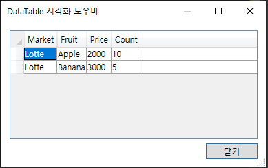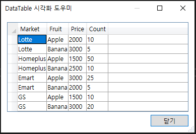 dt.Rows.Add("Lotte", "Apple", 2000, 10);
