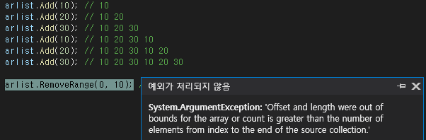 만약, 위치 또는 개수가 ArrayList.Count를 초과할 경우 에러가 발생합니다.