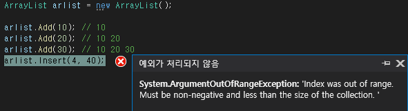 Insert() 메서드는 Arraylist.Count보다 큰 값으로 위치를 설정할 경우 크기를 벗어나므로 에러가 발생하므로 주의하여 사용합니다.