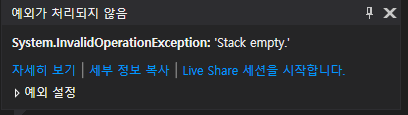 Count를 사용하여 Stack이 비어있는지 체크하거나 예외처리를 하는 코드를 작성하도록 합니다.