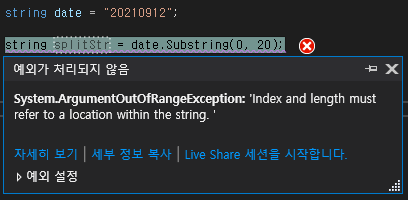 Substring() 메서드에 전달한 길이가 지정된 위치에서 문자열의 마지막까지 문자열의 길이를 초과하는 경우 에러가 발생합니다.