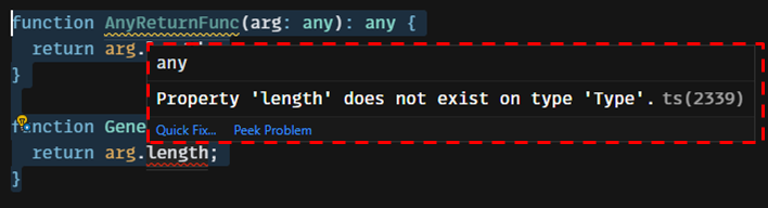 타입이 any인 코드는 경고가 없지만, 제네릭 함수는 사진처럼 경고가 발생합니다.
