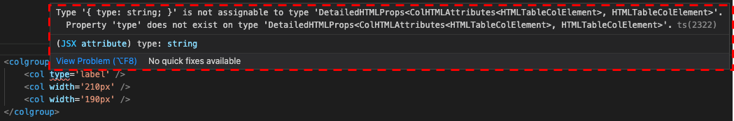 col Element는 기본 HTML 태그인데, col Element에는 type 프로퍼티가 존재하지 않습니다.