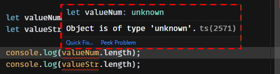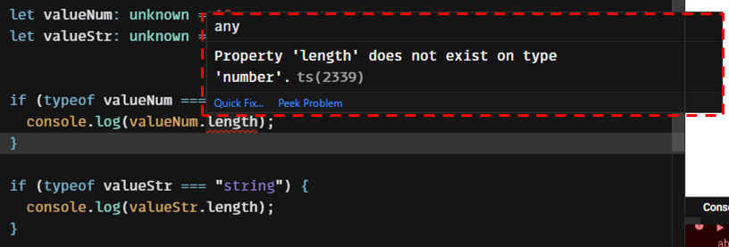 타입 검사는 정상적으로 되었지만, valueNum이 number 타입이라서 length를 사용할 수 없다고 개발자에게 경고를 전달합니다.