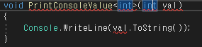 C#에서 데이터 타입은 int, double, bool형 이외에도 무수히 많기 때문에 타입의 개수만큼 PrintConsoleValue 메서드를 구현해야 하는 문제가 발생합니다.
