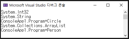 Circle 구조체와 Person 클래스는 ConsoleApp1 네임스페이스에서 제가 구현한 구조체와 클래스이므로 ConsoleApp1 네임스페이스에 속합니다.
