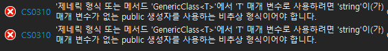 제네릭에서도 string 타입은 기본 생성자가 존재하지 않기 때문에 new 제약 조건이 있는 경우 컴파일 에러가 발생합니다.