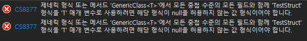 제네릭 유형 T는 struct 제약 조건을 추가하였으며, X는 class 제약 조건을 추가하였습니다.