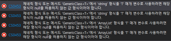 string 타입과 ArrayList는 참조 형식이므로 제약 조건에 위반되어 컴파일 에러가 발생합니다.