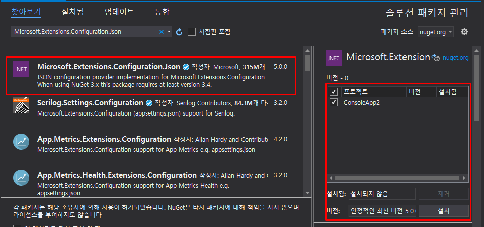 [찾아보기] 탭에서 Microsoft.Extensions.Configuration.Json 검색 후 해당 패키지를 사용할 프로젝트를 선택 후 설치하면 됩니다.