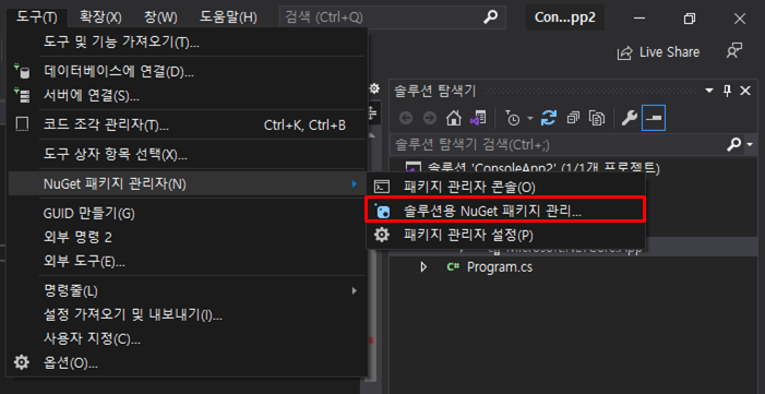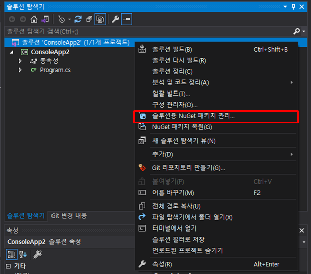 [도구 → NuGet 패키지 관리자 → 솔루션용 NuGet 패키지 관리...]로 이동하거나