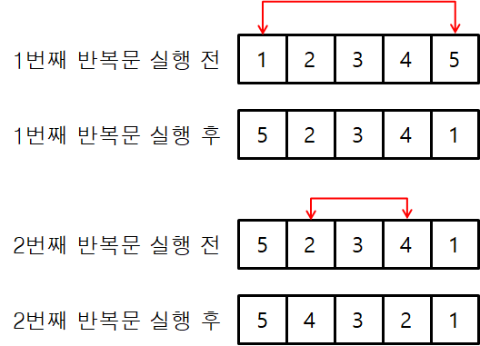 위 코드의 로직은 반복문이 증가하면서 대칭되는 위치의 값을 교환하는 로직입니다.