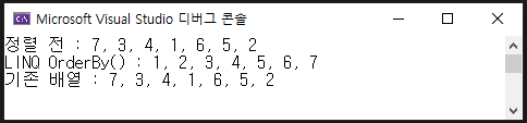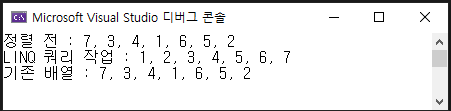 Console.WriteLine($"LINQ 쿼리 작업 : {String.Join(", ", sortArray)}");