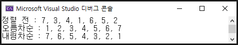 다음은 int형 배열을 Sort() 메서드를 사용하여 오름차순 정렬 후 Reverse() 메서드를 사용하여 내림차순 정렬하는 코드입니다.