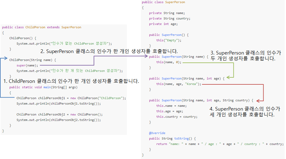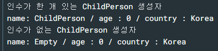 - ChildPerson 클래스에서 인수가 한 개인 생성자는 super 키워드를 사용하여 SuperPerson 클래스(부모 클래스)에서 인수가 한 개인 생성자를 호출합니다.