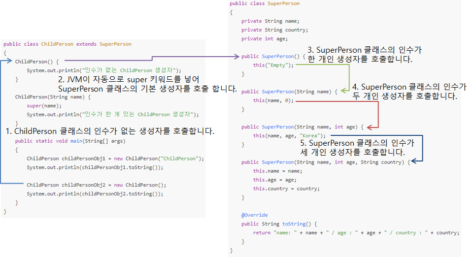 - ChildPerson 클래스에서 인수가 없는 생성자는 코드가 JVM이 자동으로 super 키워드를 넣어 부모 클래스인 SuperPerson 클래스의 기본 생성자(인수가 없는 생성자)를 호출합니다.