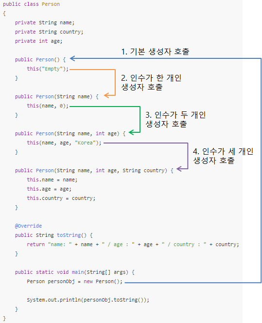 - SuperPerson 클래스에서 인수가 한 개인 생성자는 this 키워드를 사용하여 SuperPerson 클래스에서 인수가 두 개인 생성자를 호출합니다.