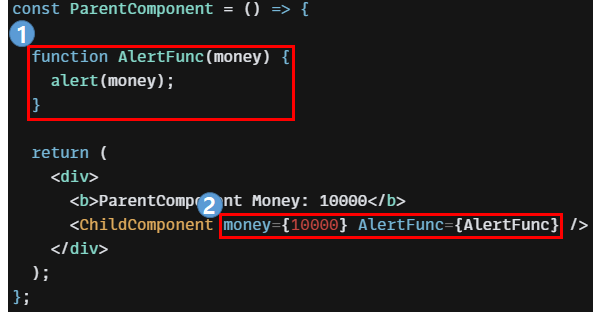 2. 1번 과정에서 구현한 함수와 값 10000을 AlertFunc와 money라는 props의 속성 이름으로 정의하여 자식 컴포넌트에게 전달합니다.