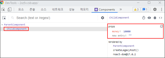 자식 컴포넌트가 props를 제대로 전달했는지 웹 브라우저에서 확인하기 위해 크롬 개발자 도구에서 상단에 Components를 클릭하여 자식 컴포넌트인 ChildComponent를 클릭합니다.