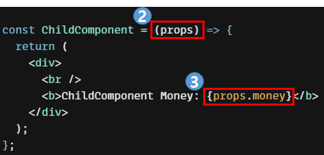 1. 부모 컴포넌트가 자식 컴포넌트에게 값(변수 또는 객체)을 전달하려면 먼저 속성 이름을 정의합니다. money라는 이름으로 props의 속성을 지정했으며, money에 값 10000을 할당합니다.