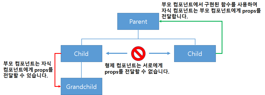 - 형제 컴포넌트끼리는 props를 전달할 수 없습니다.(부모 컴포넌트를 거쳐서 전달할 수는 있지만, 구현이 복잡합니다.)