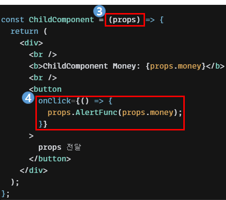 4. 버튼을 클릭하면, 전달받은 props의 AlertFunc 함수를 호출하며, props.money를 매개변수로 전달합니다.