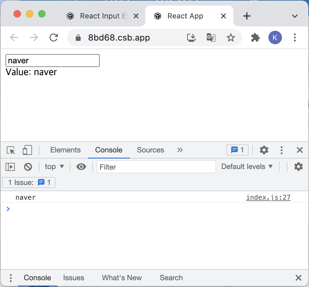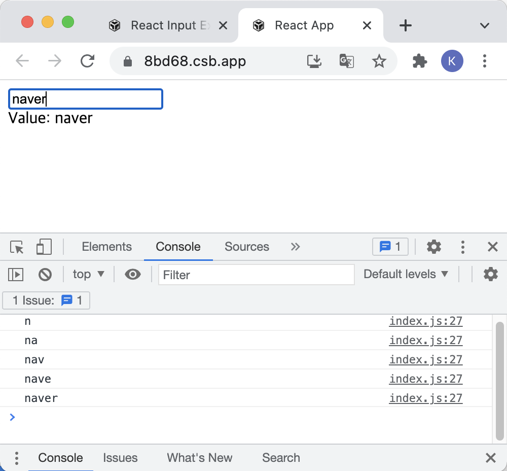 5번의 onChange 이벤트가 발생했고 onChange 이벤트 핸들러 함수인 handleChange가 5번 실행되었습니다.