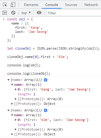 JSON.parse와 JSON.stringify를 사용하면 객체를 깊이 복사합니다. 즉, 중첩된 객체의 값을 변경해도 원래 객체의 속성 값은 변경되지 않습니다.