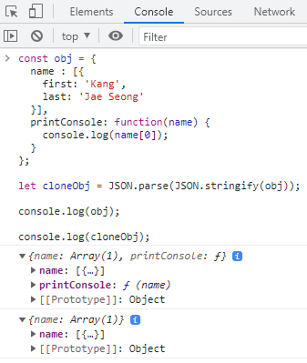 JSON은 <key>:<value> 쌍에서 value가 함수인 경우 복사를 생략합니다.