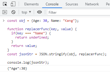 replacer 함수는 key와 value 두 개의 매개변수를 받으며, 필터링 용도로 사용할 수 있습니다.