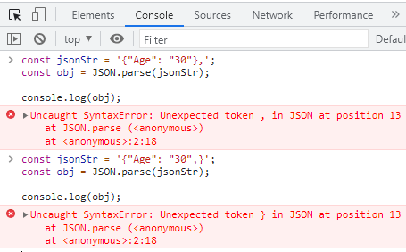 JSON 문자열에서 뒤에 쉼표가 있는 경우 JSON.parse()에서 구문 오류가 발생합니다.