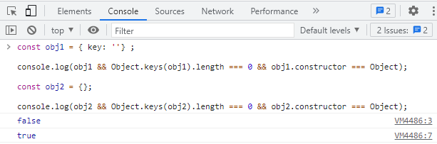 console.log(obj2 && Object.keys(obj2).length === 0 && obj2.constructor === Object);