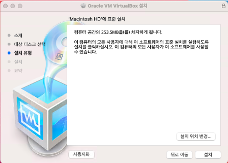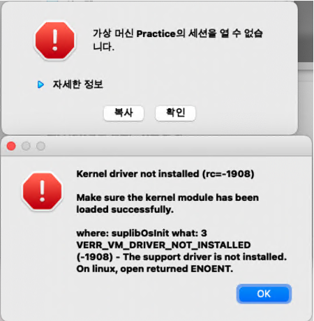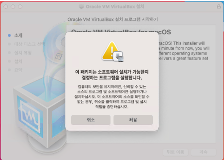 Mac에서 Oracle VM VirtualBox진입 허용을 해주지 않아서 에러가 발생합니다.