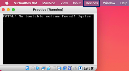 Devices → Optical Drivers → Choose a disk file... 선택 후 다운로드 받은 iso 파일 선택 후 가상 머신 종료하고 재실행